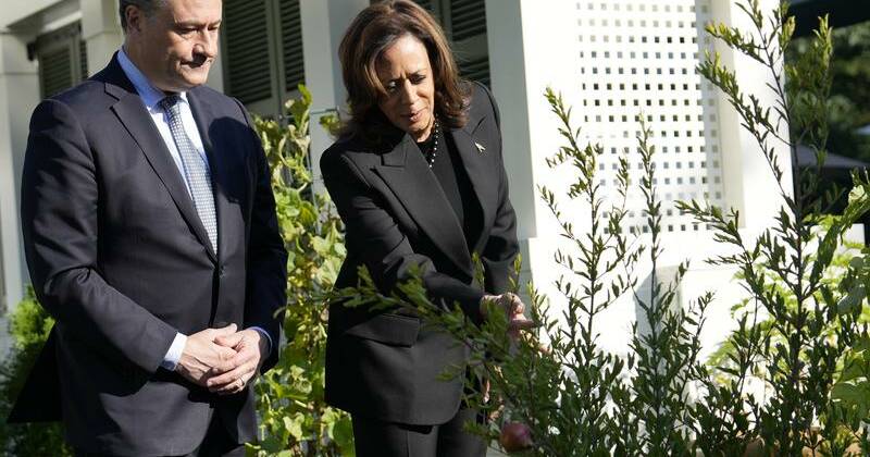 แฮร์ริสพูดคุยกับนักข่าวสั้นๆ และปลูกต้นทับทิมกับสามีของเธอในบริเวณบ้านพักรองประธานาธิบดีในกรุงวอชิงตัน ดี.ซี. เพื่อเป็นเกียรติแก่เหยื่อของการโจมตีเมื่อวันที่ 7 ตุลาคม