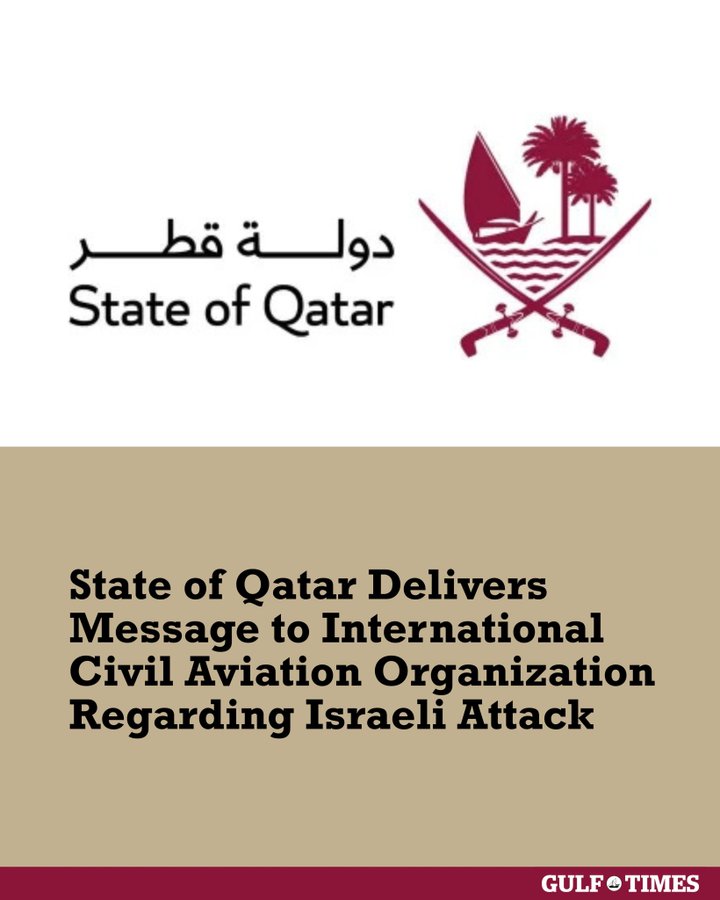 เมื่อวันเสาร์ที่ผ่านมา กาตาร์ได้ยื่นจดหมายอย่างเป็นทางการถึงองค์การการบินพลเรือนระหว่างประเทศ (ICAO) เพื่อประณามการโจมตีด้วยอาวุธของอิสราเอลในกรุงโดฮาเมื่อวันที่ 9 กันยายน ซึ่งมีเป้าหมายไปที่สถานที่อยู่อาศัยของสมาชิกสำนักงานการเมืองฮามาส และส่งผลให้มีผู้ได้รับบาดเจ็บ และเสียชีวิต ตามรายงานของสำนักข่าวอนาโดลู