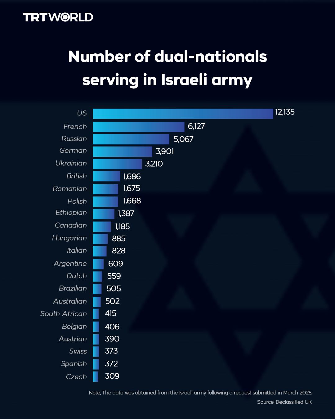 รายงานจากสำนักข่าวอนาโดลู ระบุว่า จากข้อมูลที่เผยแพร่เมื่อวันเสาร์โดยหนังสือพิมพ์เยดิโอธ อาห์โรโนธ ซึ่งอ้างอิงข้อมูลทางการของกองทัพ ระบุว่า กำลังพลของกองทัพอิสราเอลมากกว่า 50,000 นาย ถือสัญชาติอื่นอย่างน้อยหนึ่งสัญชาติ