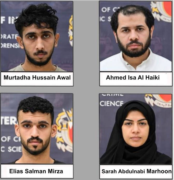 สำนักงานสืบสวนอาชญากรรมและนิติวิทยาศาสตร์แห่งบาห์เรนระบุชื่อผู้ต้องหาทั้งสี่คน ได้แก่ มูร์ทาดา ฮุสเซน อาวาล อายุ 25 ปี, อาห์เหม็ด อิซา อัล ไฮกี อายุ 34 ปี, ซาราห์ อับดุลนาบี มาร์ฮูน อายุ 36 ปี และเอเลียส ซัลมาน มิรซา อายุ 22 ปี ส่วนผู้ต้องสงสัยคนที่ห้า คือ อาลี โมฮัมเหม็ด ฮัสซัน อัล ไชค์ อายุ 25 ปี ยังคงหลบหนีอยู่ต่างประเทศ