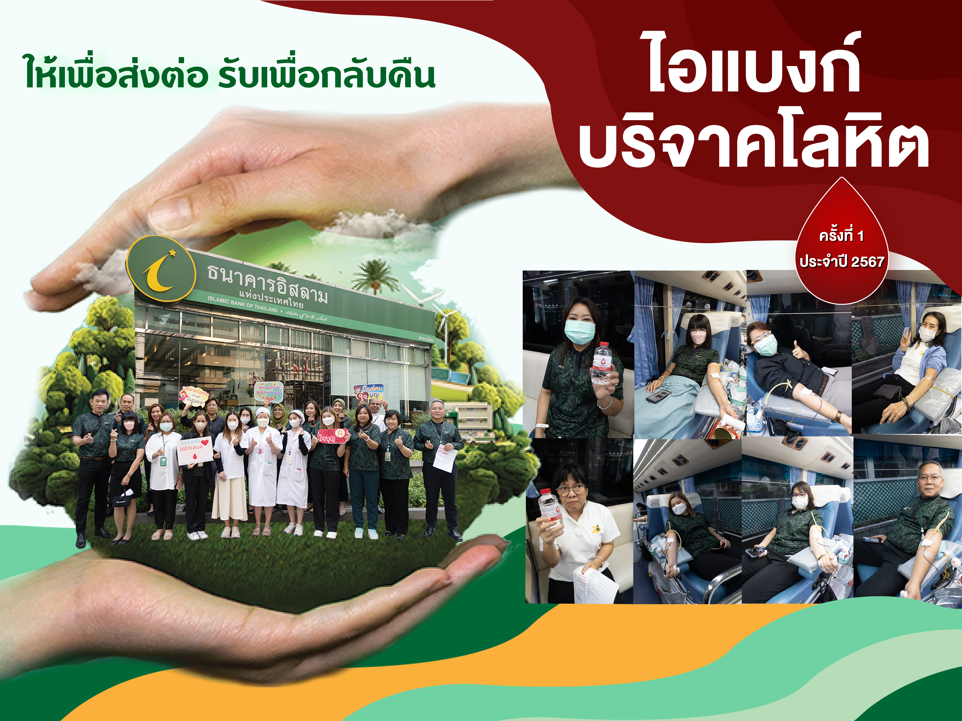 31 มกราคม 2567 ธนาคารอิสลามแห่งประเทศไทย (ไอแบงก์) จัดกิจกรรม “ไอแบงก์ร่วมบริจาคโลหิต ให้เพื่อส่งต่อ รับเพื่อกลับคืน” ครั้งที่ 1 ประจำปี 2567 โดยมีผู้บริหารและพนักงาน รวม 69 คน ร่วมบริจาคได้ปริมาณโลหิต ทั้งสิ้น 30,350 ซีซี ส่งมอบให้สภากาชาดไทย เพื่อนำไปช่วยเหลือผู้ป่วยทั่วประเทศ ต่อไป และขอเชิญชวนผู้สนใจเข้าร่วมบริจาคโลหิตครั้งที่ 2/2567 ณ สำนักงานใหญ่ ธนาคารอิสลามแห่งประเทศไทย อาคารนวม ถนนสุขุมวิท 21 ได้ในวันที่ 30 เมษายน 2567