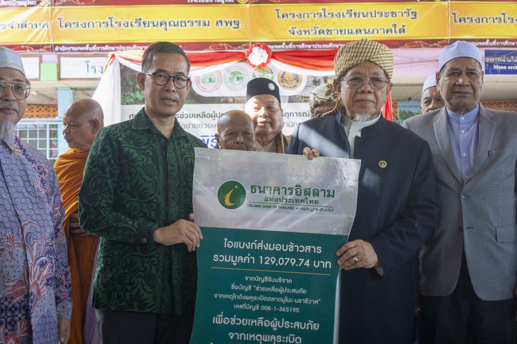 ดร.ทวีลาภ ฤทธาภิรมย์ กรรมการและผู้จัดการ พร้อมผู้บริหารธนาคารอิสลามแห่งประเทศไทย เข้าร่วมพิธีมอบบ้าน จำนวน 124 หลัง เพื่อพี่น้องมูโนะที่ได้รับผลกระทบจากเหตุพลุระเบิดในตำบลมูโนะ จังหวัดนราธิวาส ดำเนินการโดย ศูนย์ช่วยเหลือผู้ประสบภัยมูโนะ สภาเครือข่ายช่วยเหลือด้านมนุษยธรรม สำนักจุฬาราชมนตรี ในโอกาสนี้ ธนาคารได้ร่วมส่งมอบข้าวสาร 5,000 กิโลกรัม เพื่อช่วยเหลือผู้ประสบภัยจากเหตุพลุระเบิดรวม 500 หลังคาเรือน เป็นเงินมูลค่า 129,080 บาท โดยได้รับเกียรติอย่างสูงจาก นายอรุณ บุญชม จุฬาราชมนตรี เป็นผู้แทนในการรับมอบความช่วยเหลือครั้งนี้ ซึ่งธนาคารได้นำเงินจากการเปิดบัญชีรับบริจาคตั้งแต่วันที่ 31 กรกฎาคม 2566 จนถึงวันที่ 31 สิงหาคม 2566 ที่ก่อนหน้านี้ธนาคารได้ส่งมอบความช่วยเหลือเบื้องต้นไปแล้วเป็นเงิน 150,000 บาทเมื่อวันที่ 7 สิงหาคม 2566 ผ่านไปยังผู้ว่าราชการจังหวัดนราธิวาส และรองนายกรัฐมนตรีเป็นสักขีพยาน