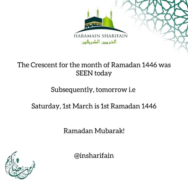 คณะกรรมการสังเกตการณ์จันทร์เสี้ยวได้ประกาศว่าซาอุดีอาระเบียสามารถสังเกตเห็นจันทร์เสี้ยวซึ่งเป็นสัญญาณการเริ่มต้นของเดือนรอมฎอนในวันเสาร์นี้ได้