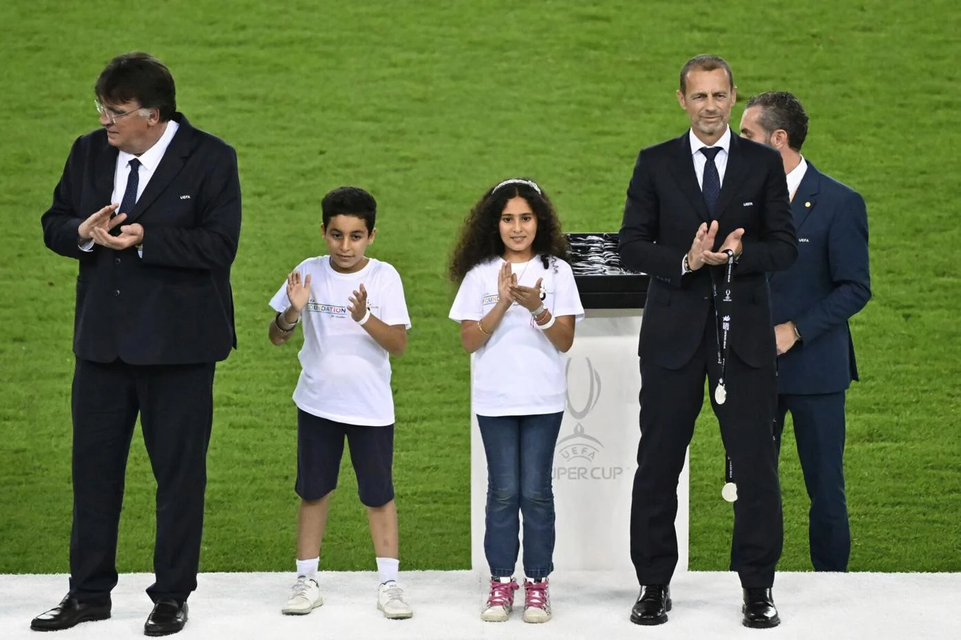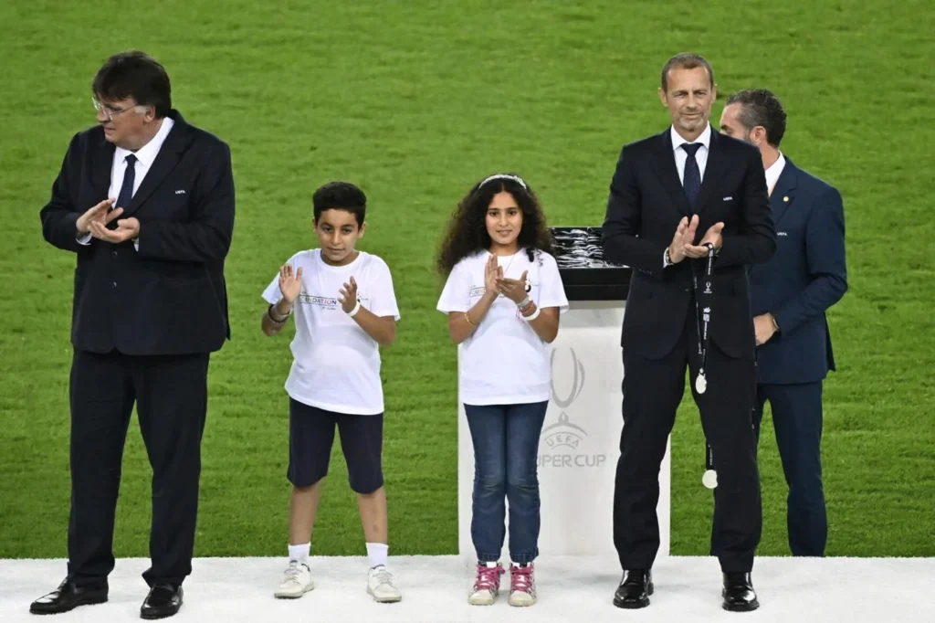 รายงานระบุว่าเด็กๆ ทาล่า วัย 12 ปี และโมฮัมเหม็ด วัย 9 ปี ร่วมยืนบนแท่นรับรางวัลร่วมกับอเล็กซานเดอร์ เซเฟริน ประธาน UEFA