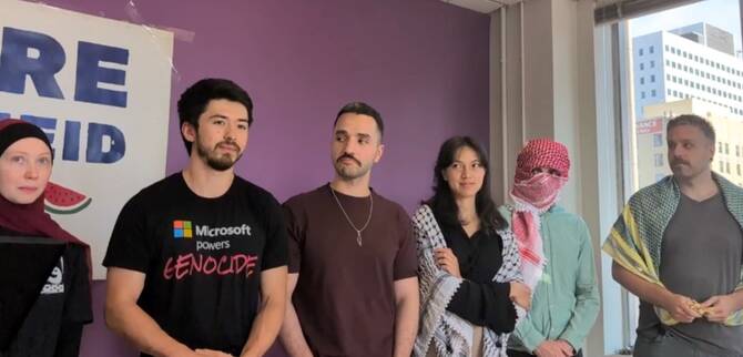 พวกเขาบอกว่าได้จัดการประท้วง “โดยสันติ” ที่สำนักงานใหญ่ของบริษัทในเมืองเรดมอนด์ รัฐวอชิงตัน รวมถึงการนั่งประท้วงที่สำนักงานของแบรด สมิธ ประธานบริษัทไมโครซอฟต์เมื่อวันอังคาร