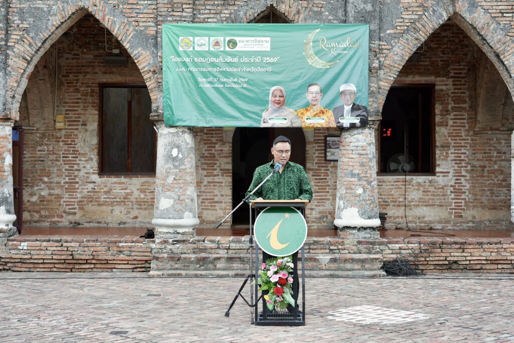 นายธีระ ยีโกบ ผู้ช่วยกรรมการผู้จัดการธนาคารอิสลามแห่งประเทศไทย (ไอแบงก์) จัดกิจกรรม “ไอแบงก์ รอมฎอนสัมพันธ์ ประจำปี 2569” ร่วมกับคณะกรรมการอิสลามประจำจังหวัดปัตตานี โดยได้รับเกียรติจาก นางพาตีเมาะ สะดียามู ผู้ว่าราชการจังหวัดปัตตานี เป็นประธานในพิธี พร้อมด้วย นายซอลาฮุดดิน หะยียูโซะ รองประธานคณะกรรมการอิสลามประจำจังหวัดปัตตานี และรองเลขาธิการคณะกรรมการกลางอิสลามแห่งประเทศไทย ดร.อาฮามัดกาแม แวมูซอ และนายมะมุง สามะ รองประธานคณะกรรมการอิสลามประจำจังหวัดปัตตานี ผศ.ดร.มะรอนิง สาแลมิง ประธานที่ปรึกษาธนาคารอิสลามแห่งประเทศไทย คุณจุฑารัตน์ ไลวานิช ประธานสภาอุตสาหกรรมจังหวัดปัตตานี คุณฟาวซี สุทธาศาสน์ ผู้บริหาร หจก.เอ็ม.ซี มอเตอร์ ซูซูกิ คุณนูรดีน วันสุไลมาน ผู้บริหารร้านอาหารมิตรไมตรี นายเศรษฐ์ อัลยุฟรี นายกองค์การบริหารส่วนจังหวัดปัตตานี นายวันสุกรี แวมามะ นายอำเภอเมืองปัตตานี นายสุไลมาน มะรอแม นายกองค์การบริหารส่วนตำบลตันหยงลุโละ ผศ.ดร.อัสมัน แตอาลี ผู้อำนวยการสถาบันฮาลาล มหาวิทยาลัยสงขลานครินทร์ วิทยาเขตปัตตานี คณะผู้บริหารและเจ้าหน้าที่ธนาคารอิสลามแห่งประเทศไทย ในพื้นที่ 5 จังหวัดชายแดนภาคใต้ และพี่น้องชาวมุสลิมเข้าร่วมกิจกรรมในพิธีละศีลอดในเดือนรอมฎอน ประจำปีฮิจเราะห์ศักราช 1447 ณ มัสยิดกรือเซะ จังหวัดปัตตานี